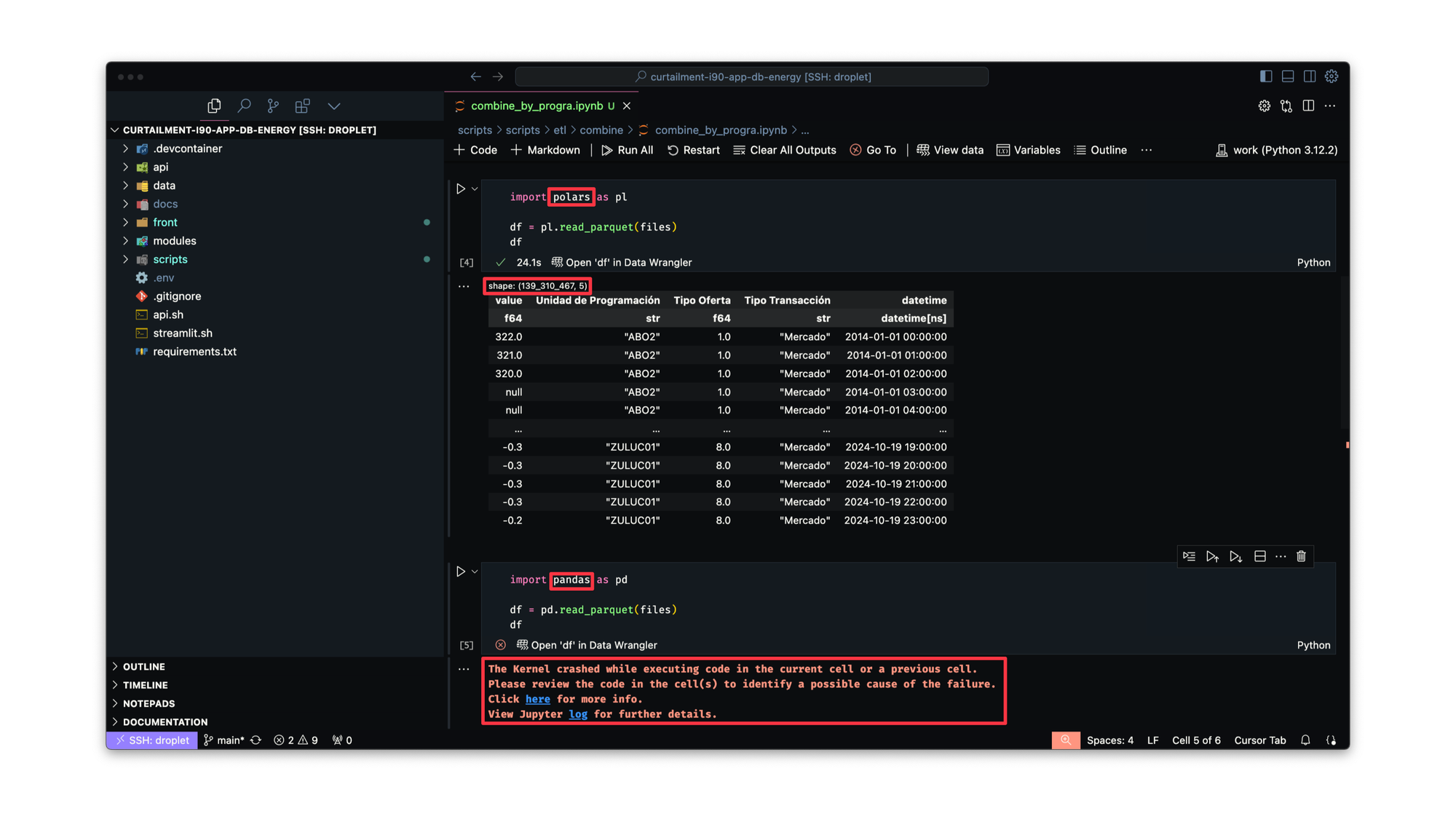 Si intentamos cargar las 139.310.467 filas de datos históricos de los archivos del Resultado de la Programación Horaria del PDBF (I90), que abarcan desde 2014 hasta los últimos datos disponibles, obtenemos los resultados mostrados en la imagen al usar dos bibliotecas diferentes: pandas y polars.